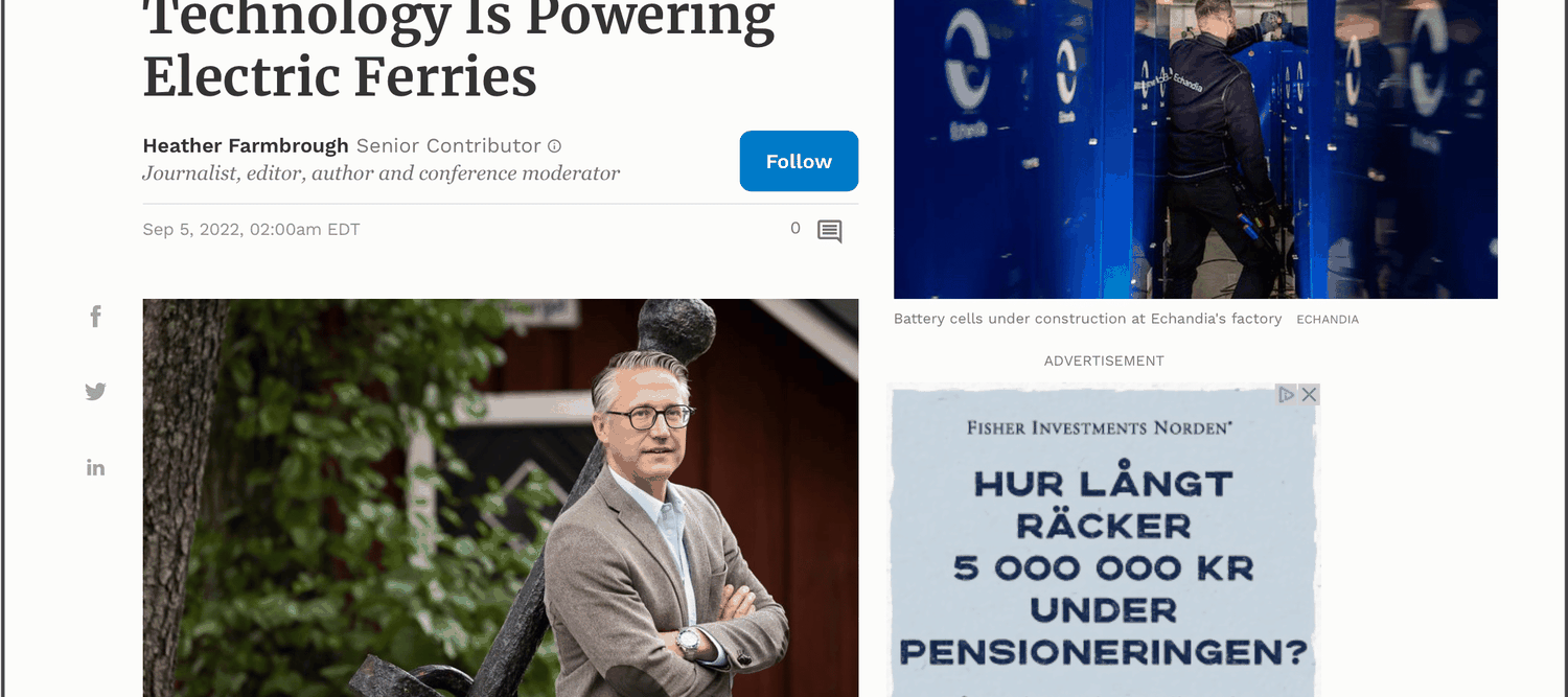 In June, our CEO, Mr Magnus Eriksson met up with Heather Farmbrough – a curious and sustainability minded writer for Forbes. Her interest in sustainability and new technology with its promise for real, change probably gauged her interest in maritime electrification and led her to Echandia.